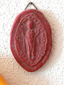 gałązka palmowa lub oliwna, globus, infuła u stóp, krzyż, księga lub zwój, lilia, ptasie pióro, wizerunek Niepokalanej |