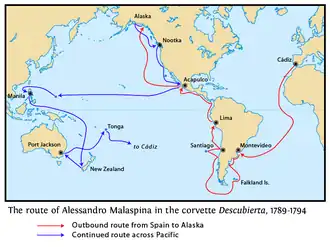 - ↑ Cutter, Donald C. (1991). Malaspina & Galiano: Spanish Voyages to the Northwest Coast, 1791 & 1792. University of Washington Press, p. 3. ISBN 0-295-97105-3.