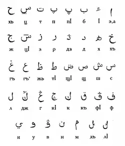 W 1825 r. kabardyjski pedagog Szora Nogmow stworzył alfabet kabardyjski na podstawie pisma arabskiego. Zawierał on 42 litery, z których 15 zostało stworzonych przez autora w celu oznaczenia dźwięków specyficznych dla języka kabardyjskiego[2].
