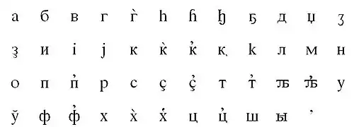 | Ç ç | Ч ч | Ǵ ǵ | Г г | Ĵ ĵ | Жь жь | ||