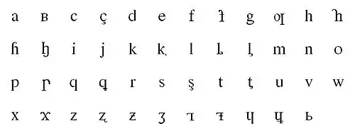 , Lh lh, M m, N n, O o, P p, Ph ph, R r, S s, Š š, Ş ş, T t, Th th, U u, F f, Fh fh, X x, Xu xu, X̌ x̌, X̌u x̌u, ɦ, C c, Ç ç, Ch ch, Y y, H h, ', Ù ù, Je je, Jo jo, Ju ju, Ja ja.
