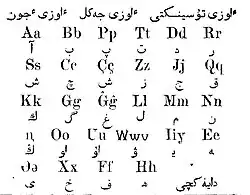 - alfabet łaciński – dekretem Prezydenta nr 569 z dnia 26 października 2017 r. wprowadzono nakaz zastąpienia cyrylicy alfabetem łacińskim do 2025 r.[1][2] W latach 1929–1940 na obszarze ZSRR i Mongolskiej Republiki Ludowej obowiązywał zapis alfabetem janalif.
