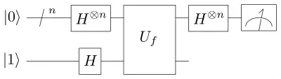 Algorytm zaczyna się ustaleniem dwubitowego stanu A: i zaaplikowaniu przekształcenia Hadamarda do każdego kubitu, co daje stan B: