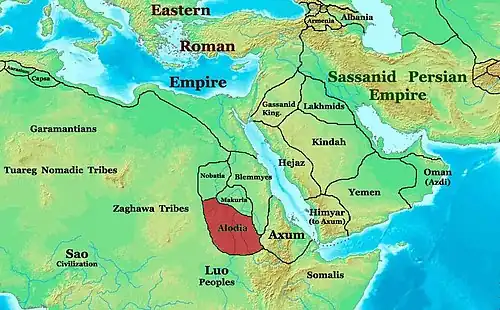 Alodia jako ukształtowane państwo pojawia się przy okazji chrystianizacji ziem między Egiptem a Etiopią, której władcy z królestwa Aksum od IV wieku byli chrześcijanami. Zaraz po nawróceniu Aksum, terenem ożywionej działalności misyjnej stała się Nubia, a działali tu głównie mnisi egipscy. W V wieku oficjalnie doszło do rozłamu chrześcijaństwa wschodniego na tle sporów chrystologicznych. Zwolennicy monofizytyzmu i diofizytyzmu zaczęli się nawzajem zwalczać. Monofizytyzm cieszył się poparciem kościoła egipskiego i tamtejsi duchowni głosili chrześcijaństwo w Nubii przy zachowaniu nauki monofizyckiej. Tymczasem w okolicach połowy VI wieku cesarz Justynian, będący zdania, iż tylko chrystianizacja plemion nubijskich przyniesie spokój egipskiej granicy imperium, zaczął wysyłać tu misjonarzy, którzy głosili oczywiście doktrynę, której przychylny był cesarz, czyli diofizytyzm.