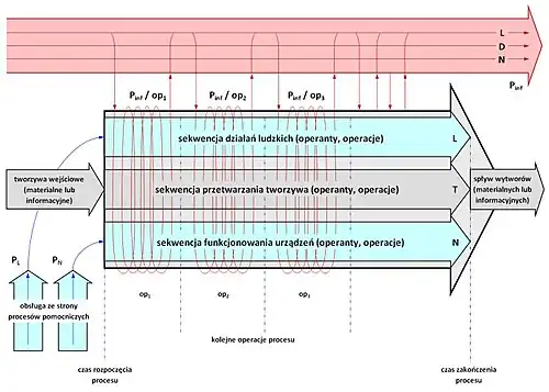 Funkcjonowanie dowolnego procesu PET wymaga obsługi sekwencji działań człowieka [L] oraz sekwencji funkcjonowania urządzeń (i narzędzi) [N] ze strony procesów pomocniczych Ppom. Można wymienić cztery kategorie Ppom: