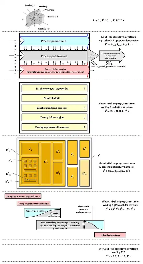 - Trzeci przekrój odzwierciedla hierarchiczną strukturę wszelkich komórek „organizacyjnych” (podstawowych, pomocniczych i informacyjnych), składających się na SET: S³ = < Kpod; Kpom; Kinf; R³ >.