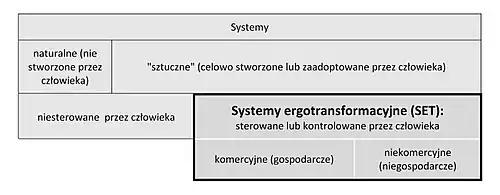 - System, w którym w wyniku działania specyficznej kombinacji zgrupowanych i wzajemnie sprzężonych procesów ergotransformacyjnych PET (procesów podstawowych oraz wspomagająco-obsługujących procesów pomocniczych i informacyjnych) następuje sterowane przez człowieka (ludzi) przetwarzanie tworzyw materialnych i informacyjnych w docelowe wytwory materialne lub informacyjne, realizujące przewidywane potrzeby odbiorców (użytkowników, klientów).