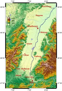 Położony jest na równinie nadrzecznej, ograniczonej od wschodu Renem, a od zachodu masywem Wogezów. Do głównej doliny schodzą z zachodu na wschód doliny mniejszych dopływów Renu. Znajdują się tu rozległe tereny leśne, głównie w Wogezach oraz na północy departamenty Bas-Rhin (lasy Haguenau).