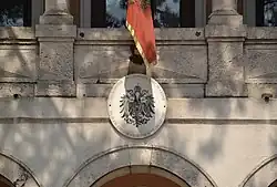 Stosunki dyplomatyczne pomiędzy Austro-Węgrami a Księstwem Czarnogóry nawiązano w 1879 roku. Obecny obiekt, położony na skrzyżowaniu ulic Baja Pivljanina i Sava Burića, wybudowano w latach 1897-1899 z dala od placówek innych krajów. Architektem był Chorwat Josip Slade. Dwupiętrowy gmach reprezentuje styl neorenesansowy, natomiast połączona z nim kaplica katolicka styl neoromański. Wewnętrzne prace wykończeniowe trwały do 1903 roku. Główne wejście do budynku ma postać werandy z trzema łukami, nad którą znajduje się balkon. Nad drzwiami umieszczono replikę dwujęzycznej tablicy urzędowej z herbem Cesarstwa Austrii. Przy bramie wejściowej zachowała się budka wartownicza.