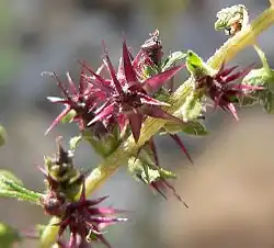 - Męskie i żeńskie zebrane w osobne koszyczki, wyrastające na tej samej roślinie (→ jednopienność) lub rzadziej na różnych roślinach (→ dwupienność)[12][7]. W przypadku roślin jednopiennych koszyczki męskie wyrastają skupione w wydłużonych groniastych lub kłosopodobnych kwiatostanach złożonych w szczytowych częściach pędów. Koszyczki męskie są krótkoszypułkowe i zwieszone, z reguły liczne, drobne, rozmieszczone pojedynczo w kwiatostanie złożonym lub skupione w jego obrębie w pęczkach. Koszyczki żeńskie wyrastają w kątach liści i zawierają pojedyncze kwiaty żeńskie (rzadko jest ich kilka[7]). Okrywa kwiatostanów męskich jest zrosłolistkowa (z wolnymi końcami listków) i miseczkowata, w kwiatostanach żeńskich okrywa drewnieje i tworzy skorupę otaczającą kwiat, a później owoc[12]. Kwiaty męskie, których w koszyczku jest zwykle od kilku do 20[12] (rzadziej więcej[7]) mają korony rurkowate[8], białawe do fioletowawych[7] i niemal wolne pylniki[12]. Ze szczytu koszyczka żeńskiego na zewnątrz wystają znamiona[12].
