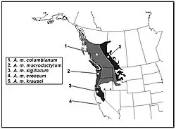 - Podgatunek południowy, w przypadku którego nie zarejestrowano tożsamości DNA mitochondrialnego[75]. Wedle Fergusona w południowym środkowym Oregonie spotyka się z A. m. columbianum, tamtejsza populacja wykazuje cechy pośrednie pomiędzy podgatunkami[21].