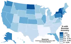 Zgodnie z amerykańskim spisem powszechnym z 2000 roku, 706 242 Amerykanów wskazywało rosyjski jako ich język mówiony. Duże skupiska rosyjskich amerykanów występują w Anchorage na Alasce, w Bostonie, w Filadelfii, w Cleveland, w Chicago, w Nowym Jorku w dzielnicy Bronx i Brooklyn i wielu innych.