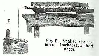 W procesie tym powstaje swobodny azot, który zbiera się w probówce (E) napełnionej rtęcią i umieszczonej w miseczce (C) również zawierającej rtęć wobec czego powstaje azot (gaz), z którego objętości można obliczyć jego ciężar.