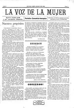 Argentynka Virginia Bolten jest odpowiedzialna za wydawanie gazety pt. „La Voz de la Mujer” (polski: „Głos kobiety”), publikowanej 9 razy między 8 stycznia 1896 r. a 1 stycznia 1897 r. w Rosario, i reaktywowanej na krótko w 1901 r. Podobna publikacja o takiej samej nazwie była później publikowana w Montevideo, co sugeruje, że Bolten prawdopodobnie założyła i redagowała ją po swojej deportacji[7]. La Voz de la Mujer opisuje siebie jako „poświęcony postępowi komunizmu anarchistycznego”. Jego motyw przewodni to wielorakość natur opresji kobiet. Artykuł wstępny zapewnia: „Wierzymy, że w społeczeństwie współczesnym, nic i nikt nie jest w bardziej mizernej sytuacji od niefortunnych kobiet”. Mówi, że kobiety są podwójnie uciśnione: poprzez burżuazyjne społeczeństwo i mężczyzn. Te idee są widoczne w ataku na małżeństwa i męskiej dominacji nad kobietą. Autorzy La Voz de la Mujer, anarchistyczne feministki i anarchistyczny feminiści, rozwinęli idee ucisku skupionego na płci. Uważali małżeństwo jako burżuazyjny związek, który ogranicza wolność kobiety, włącznie z wolnością seksualną. Widzieli oni wchodzenie w związek małżeński bez miłości, wierność zapewnioną przez strach (a nie pożądanie) oraz ucisk ze strony nienawidzonych małżonków jako przymus podyktowany przez akt małżeństwa. Ubolewali oni nad tą alienacją indywidualnej osoby i starali się to naprawić, początkowo poprzez wyzwoloną miłość, później przez rewolucję społeczną[8].