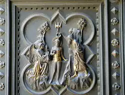 - ↑ Drzwi Pisana są pierwszymi z trzech, jakie łącznie wykonano dla baptysterium. Na wykonanie drugich rozpisano na początku XV wieku konkurs, w którym brał udział m.in. Filippo Brunelleschi i Lorenzo Ghiberti, a zwyciężył ten drugi. Trzecie, nazywane Drzwiami Raju, także wykonał Ghiberti.