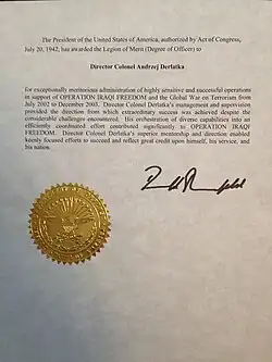 - Legion of Merit (Officer) (2004) – nadany przez prezydenta USA Georga W. Busha na wniosek sekretarza obrony USA Donalda Rumsfelda (za skuteczne i pomyślne zarządzanie w okresie od lipca 2002 r. do grudnia 2003 r. działaniami polskiego wywiadu wspierającymi "Operację IRAQI FREEDOM oraz Globalną Wojnę z Terroryzmem").