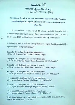 - ↑ Decyzja Nr 95 Ministra Obrony Narodowej z dnia 24 marca 2009 roku zmieniająca decyzję w sprawie mianowania oficerów Wojska Polskiego zamordowanych w Katyniu, Charkowie i Twerze na kolejne stopnie oficerskie. Decyzja nie została ogłoszona w Dzienniku Urzędowym MON. Decyzja weszła w życie z dniem podpisania.