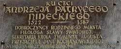 KU CZCI/ ANDRZEJA PATRYCEGO NIDECKIEGO / 1522-1587 / DOBROCZYŃCY RODZINNEGO MIASTA,/ FILOLOGA SŁAWY ŚWIATOWEJ, / SEKRETARZA KRÓLA ZYGMUNTA AUGUSTA,/ PRZYJACIELA JANA KOCHANOWSKIEGO, / NA WIECZNĄ RZECZY PAMIĄTKĘ - ZIOMKOWIE - OŚWIĘCIM - 1984 r.