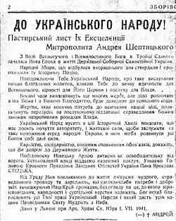 - ↑ Pomiędzy młodzieżą znajdują się też starsi, którzy nią kierują; ale mieliśmy aż nadto dowodów na to, że między tymi kierownikami młodych zbyt często i zbyt łatwo znajdują się agenci naszych wrogów, którzy po prostu prowokują młodzież do czynów bezprawnych, do kroków nierozważnych, które tylko mszczą się na całej gromadzie. Byliśmy świadkami nawet strasznych morderstw dokonanych przez młodych ludzi, może nawet w dobrych zamiarach, ale ze zgubnymi następstwami dla narodu. Widzieliśmy nieraz ludzi, którzy przekazywali naszej młodzieży nakazy naszych narodowych przewodników i rozkazywali dla dobra sprawy kogoś zabić. Było dużo takich wypadków, że sami prowodyrzy młodzieży głośno i publicznie stwierdzali, że agenci, którzy nakazywali zabójstwa, byli prowokatorami i służyli naszym wrogom. Niestety takie wypadki wytworzyły wśród młodzieży fałszywe przeświadczenie; że można kogoś pozbawić życia. Kilka już razy przestrzegałem wszystkich wiernych przed strasznymi następstwami nieprzestrzegania V prawa Bożego, które zabrania mordowania ludzi. Nieraz już przestrzegałem przed tymi wszystkimi namiętnościami, które otwierają człowiekowi drogę do tego przestępstwa ściągającego na duszę przekleństwo Niebios, na ciało nakładającego piętno niewinnie przelanej krwi, to piętno, którego nie zmaże żadna pokuta! Przestrzegałem przed złością, przed narodową nienawiścią, przed partyjnymi kłótniami, przed dążeniem pomsty na wrogach.(...) Dlatego dziś, Drodzy Bracia, zwracam się do Was, starszych w gromadzie, i w imieniu Chrystusa Zbawiciela oddaję Wam opiekę i straż nad życiem ludzkim i nad mieniem tych, którym mogłaby grozić śmierć albo utrata całego majątku. Życia i mienia bliźnich strzeżcie w imię cywilizacji chrześcijańskiej i w imię tego chrześcijańskiego ładu społecznego, jaki chcielibyśmy kiedyś widzieć w naszym niepodległym powszechnym państwie ukraińskim. Bądźcie przekonani, że wszystko, co zrobicie w kierunku tak pojętej miłości bliźniego, przyniesie błogosławieństwo Boże waszej rodzinie i waszej wiosce. Jesteśmy przekonani, że jeżeli w każdej gromadzie naszego kraju wszyscy starsi obywatele wezmą do serca nasze wezwanie i w chwilach zamieszek i anarchii przyczynią się do utrzymania chrześcijańskiej wierności prawu Bożemu, jaka musi być początkiem każdego początku, stanowisko Wasze ściągnie na cały naród błogosławieństwo Boże. Dziś muszę jeszcze raz wrócić do tej przestrogi. Zmienię to tylko, chyba że przestrogę pod adresem młodych skieruję na wasze ręce. Źródło.