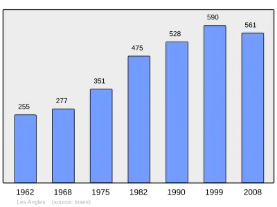Według danych na rok 1990 gminę zamieszkiwało 528 osób, a gęstość zaludnienia wynosiła 12 osób/km² (wśród 1545 gmin Langwedocji-Roussillon Angles plasuje się na 503. miejscu pod względem liczby ludności, natomiast pod względem powierzchni na miejscu 79.).