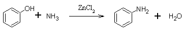 Anilina powstaje też w reakcji fenolu z amoniakiem w obecności chlorku cynkowego jako katalizatora: