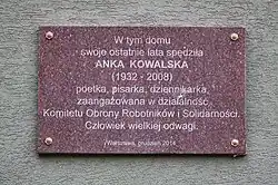 - ↑ Anka Kowalska upamiętniona [online], Urząd Miasta Warszawa, 19 stycznia 2015 [dostęp 2024-07-04].