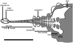 Kostna buława na ogonie ankylozaura także składała się z kilku dużych osteoderm, zespolonych z kilkoma ostatnimi kręgami ogonowymi. Była bardzo ciężka i wspierała się na siedmiu ostatnich kręgach ogona, które uległy przemieszczeniu, formując sztywny pręt u podstawy maczugi. Zachowały się przyczepiające się do nich grube ścięgna, częściowo skostniałe i niezbyt elastyczne. Gdy zwierzę machało ogonem, dzięki nim wielka siła przenoszona była na sam jego koniec. Wydaje się, że dinozaur używał swej buławy podczas aktywnej obrony. Kostna maczuga gromadziła wystarczającą energię, by przy bezpośrednim uderzeniu złamać napastnikowi kości[4]. Badania z 2009 wykazały jednak, że tylko duże buławy posiadały zdolność kruszenia kości, czego nie były w stanie dokonać te średniej i małej wielkości, nie generując wystarczającej siły. Wynika z nich, że choć Ankylosauridae mogły rzeczywiście czynić wymachy swym ogonem, pozostaje jednak niewyjaśnione, czy broń służyła podczas walk wewnątrzgatunkowych, obrony przed zwierzętami innych gatunków, czy też podczas obydwu tych sytuacji[5]. Istniał pogląd, że buława służyła jako wabik, udając głowę. Teorię tę jednak powszechnie odrzucono[6].