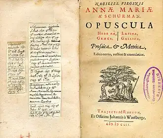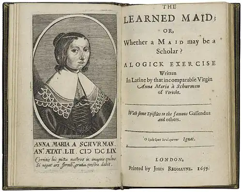 - ↑ Jaśmina Korczak-Siedlecka, Anna Maria van Schurman i walka o dostęp kobiet do edukacji w XVII wieku, w: „Civitas Hominibus: rocznik filozoficzno-społeczny” 2016, vol. 1, s. 23–24.