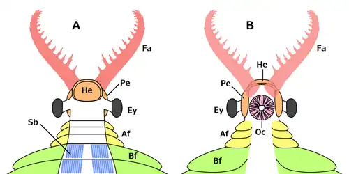 - ↑ Stephen Pates, Allison C. Daley, Nicholas J. Butterfield, First report of paired ventral endites in a hurdiid radiodont, „Zoological Letters”, 5 (1), 2019, s. 18, DOI: 10.1186/s40851-019-0132-4, ISSN 2056-306X, PMID: 31210962, PMCID: PMC6560863 [dostęp 2020-02-15] (ang.).
