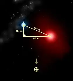 - ↑ Oznacza to, że obie gwiazdy są wierzchołkami trójkąta prostokątnego takiego, w którym przyprostokątne mają długości 529 au oraz 224 au. Z twierdzenia Pitagorasa, odległość s jest równa: s² = 529² + 224² = 279 841 + 50 176 = 330 017, zatem s ≈ 574.
