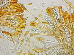 Owocniki typu apotecjum występujące pojedynczo lub w grupach. Początkowo mają typowy kształt miseczki, później rozpłaszczają się. Brzeg z ciemnobrązowymi, bardzo krótkimi włoskami (długość do 30 µm), grubość do 15 µm. Powierzchnia hymenialna żółto-pomarańczowo-różowa. Zarodniki eliptyczne z dwoma dużymi gutulami[3].