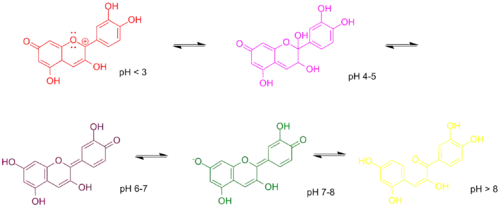 Stabilność antocyjanidyn jest zależna od pH. Przy niskich wartościach pH (odczyn kwasowy) w roztworze są obecne barwne antocyjanidyny, a natomiast przy wyższych wartościach pH (odczyn zasadowy) obecne są bezbarwne formy chalkonowe.