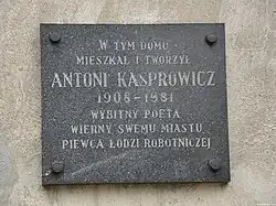 W tym domu mieszkał i tworzył Antoni Kasprowicz – 1908–1981 – wybitny poeta i wierny swemu miastu piewca Łodzi robotniczej[2].
