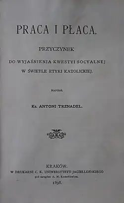 - Praca i płaca - przyczynek do wyjaśnienia kwestyi socyalnej w świetle etyki katolickiej (1898)