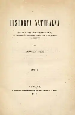 - ↑ Antoni Waga, Historya naturalna. Dzieło wskazujące pomoc do nauczenia się tej umiejętności, uważanej w głównych stanowiskach jej wzrostu. T. 1 [online], polona.pl [dostęp 2019-08-06].
