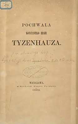 - Pochwała hr. Konstantego Tyzenhauza w: Oologia ptaków polskich, Warszawa 1862 i odb. Warszawa 1862