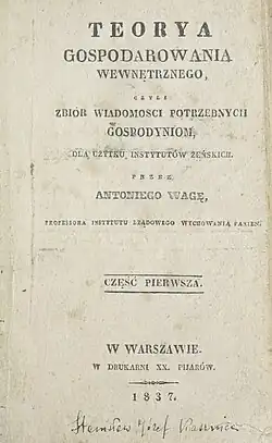 - ↑ Antoni Waga, Teorya gospodarowania wewnętrznego, czyli Zbiór wiadomości potrzebnych gospodyniom dla użytku instytutów żeńskich. Cz. 1 [online], polona.pl [dostęp 2019-08-06].