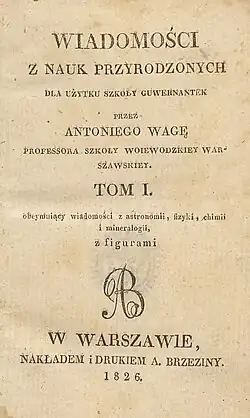 - ↑ Antoni Waga, Wiadomości z nauk przyrodzonych. Dla użytku szkoły guwernantek. T. 1, Obeymuiący wiadomości z astronomii, fizyki, chimii i mineralogii z figurami [online], polona.pl [dostęp 2019-08-06].