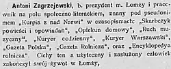- ↑ J. Gwardiak, Urzędnik - człowiek pióra - prezydent Łomży Antoni Zagrzejewski (1820-1898), "Studia Łomżyńskie", 2001, t. 12, s. 133.