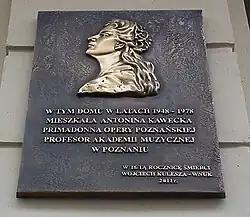 - ↑ Marek Zaradniak, Odsłonięcie tablicy upamiętniającej Antoninę Kawecką [online], Akademia Muzyczna im. Ignacego Jana Paderewskiego w Poznaniu, 5 grudnia 2021 [dostęp 2025-03-18] (pol.).