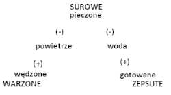 Lévi-Strauss, posługując się opozycjami binarnymi nieprzetworzone-przetworzone, surowe-warzone, pieczone-gotowane, odpowiadającymi opozycji natura-kultura, stworzył schemat mający obrazować przejście człowieka od natury do kultury. „Surowe” jest biegunem nienacechowanym, który ulega przekształceniu kulturalnemu w „warzone”, lub przekształceniu naturalnemu w „zepsute”, „warzone” i „zepsute” są więc biegunami nacechowanymi. Z kolei „pieczone” i „wędzone” przeciwstawia „gotowanemu”, z racji użytych środków przetworzenia („pieczone” i „wędzone” – powietrze, „gotowane” – woda) te pierwsze umieszcza po stronie natury, „gotowane” natomiast po stronie kultury. Ze względu na wyniki „wędzone” po stronie kultury, „pieczone” i „gotowane” po stronie natury. Uważa, że wyższość znaczenia pieczonego mięsa nad gotowanym jest uniwersalną cechą kultury, ponieważ gotowane wykorzystuje cały potencjał pokarmu wraz z sokami, natomiast pieczone pociąga za sobą straty. Zauważa również, że w większości przypadków wyobraźnia ludowa, przypisuje „pieczonemu” cechy bardziej pierwotne niż gotowanemu, ma to swoje odzwierciedlenie w mitach genezyjskich[8].