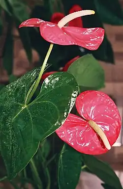 - Anthurium ×ferrierense (A. andraeanum × A. nymphaeifolium), o bladoróżowych kwiatostanach.