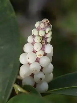 - Owocostan zwykle zwisły, niekiedy wzniesiony, składa się z różnobarwnych jagód, podłużnych do jajowatych, o cienkim egzokarpie oraz mięsistym, soczystym, przezroczystym i słodkim mezokarpie. Każda jagoda składa się z dwóch komór, zawierających po jednym, spłaszczonym nasieniu[8].