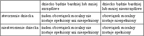 Widać od razu, że czyn „niestworzenie dziecka” ma przewagę nad czynem „stworzenie dziecka”, ponieważ ma równie dobre skutki w jednym wyniku i lepsze skutki w drugim wyniku. Powinien więc być uznawany za lepszy tak długo, jak nie będziemy w stanie całkowicie wykluczyć tego, że dziecko będzie mniej lub bardziej nieszczęśliwe, a nigdy nie jesteśmy w stanie tego zrobić. Mamy więc, zamiast punktu (3), daleko idące konsekwencje: (3') Zawsze moralnie wskazane będzie niestworzenie dziecka.