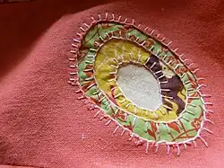 Aplikacja z wszywanym motywem, nazywana inkrustowaną lub mozaiką sukienną, polegała na tym, że w głównej tkaninie stanowiącej tło wycinano zaplanowany motyw i w to miejsce wszywano inną tkaninę. Najczęściej do tego typu dekoracji stosowano sukno (brzegi takiej tkaniny nie strzępią się)[2].