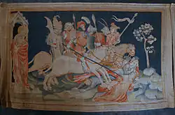 Pierwotnie cykl składał się z 90 scen podzielonych na sześć części. Każda z tych części tworzyła prostokąt o wymiarach 24 metry szerokości i 6.1 metrów wysokości[15] Do dziś zachowały się 71 scen[16]. Poszczególne epizody obramione są z dwóch dłuższych stron bordiurami. Na przemian użyto ciemnych błękitów i czerwieni do teł, natomiast większość postaci, monstrów, fauny i flory oraz elementów scenerii architektoniczno-krajobrazowej utrzymano w odcieniach koloru kości słoniowej. Szeroką gamę barw (w tym srebrne i złote nici) wykorzystano do podkreślenia konturów i poszczególnych detali[17].