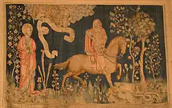 - Scena 8: Jeździec-zwycięzca dzierżący łuk pędzący na koniu siwej maści (pierwsza pieczęć) [Ap 6, 1-2]