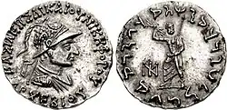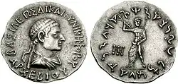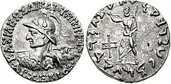 Rewers: Zeus, napis w kharoszthi: MAHARAJASA DHRAMIKASA JAYADHARASA ARKHEBIYASA "Archebiusz, zwycięski król dharmy"