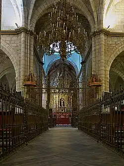 Chór znajduje się w nawie głównej, tworzy go prostokąt o wymiarach 14,8 x 7,8 m. Znajdują się w nim dwa rzędy krzeseł (43 wysokie + 36 niskie). Jest dekorowany płaskorzeźbami przedstawiającymi postacie ze Starego i Nowego Testamentu oraz świętych i Doktorów Kościoła.