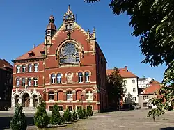 - Budynek Łaźni Miejskiej (ul. A. Mickiewicza 5) – wzniesiony w latach 1894–1895 w stylu ceglanego historyzmu; przebudowany w latach 1997–1999; jest to obiekt dwubryłowy, z czego część frontowa jest trójkondygnacyjna, a pierwotnie w niej funkcjonowały łazienki, zakład fryzjerski i łaźnia rzymska, a za nią znajduje się niższa część, w której działał basen[32],